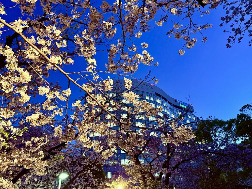 今年も、この場所、天神中央公園から、桜を見ることができました。